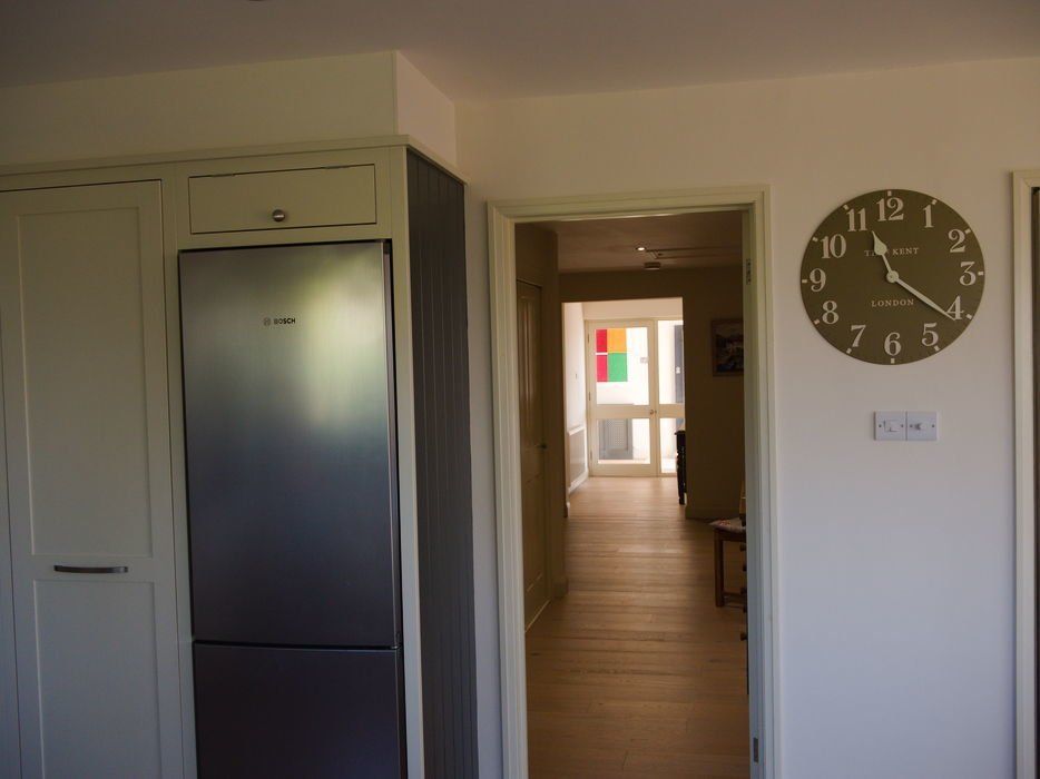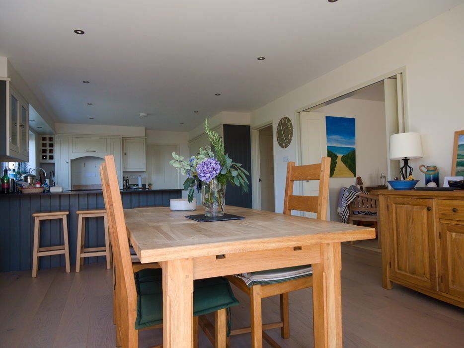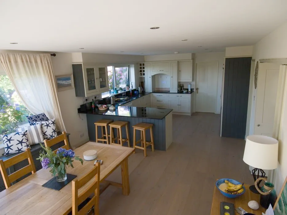 A complete internal and external refurbishment of a house in Thurlestone which included the creation of open plan kitchen, dining and living room areas, hand built kitchen and bespoke shelving in the lounge to maximise on space and storage.